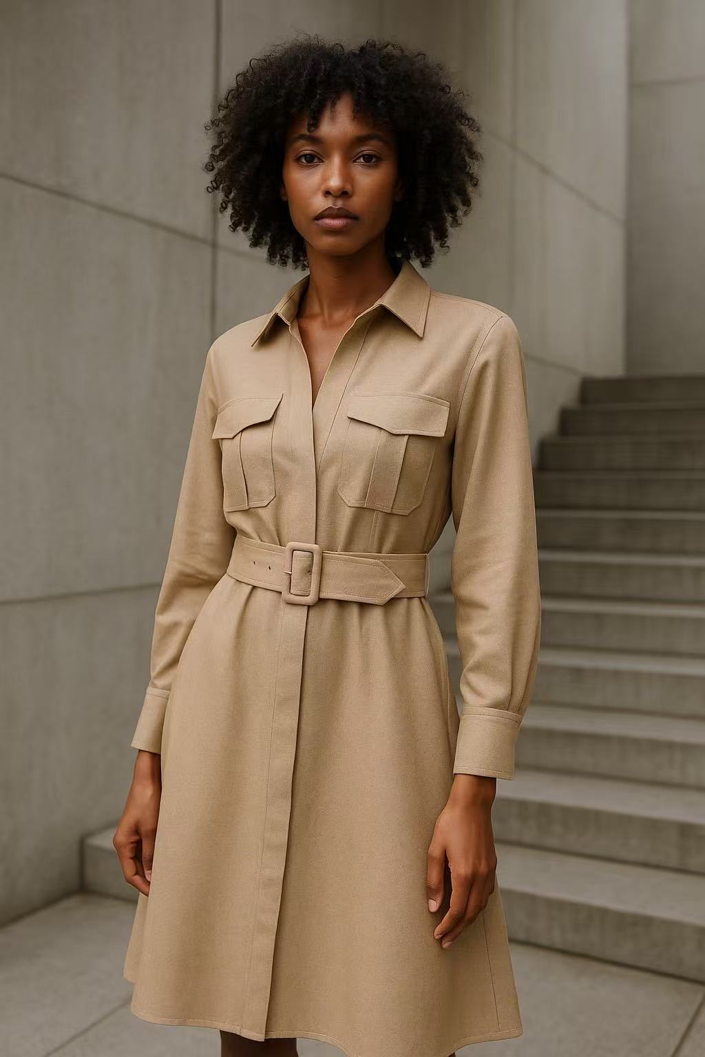 The beige shirt dress comes with a pointed collar and chest pockets. A wide belt cinches the waist, enhancing the silhouette. Long sleeves and a knee - length cut make it suitable for both casual and semi - formal events.